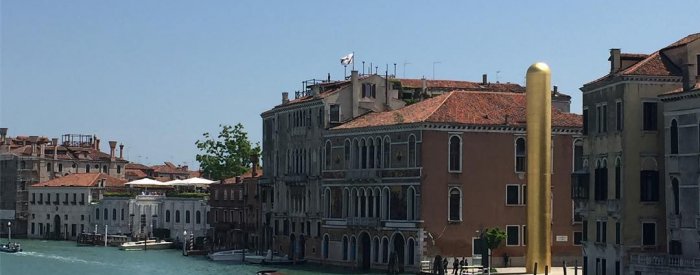 Hardly a single visitor to the preview last week failed to snap an image of James Lee Byars’ The Golden Tower that has been erected on the edge of the Grand Canal by Michael Werner Gallery (which represents the artist’s estate) and Fondazione Giuliani, especially for the Biennale. Standing at 20 feet high, the gilded totemic sculpture posthumously realises the artist’s intentions to present the work in a public space and particularly in Venice – a city with which Byars had a strong connection. In its prime location, it became the focal point for Instagram-happy visitors to Venice.